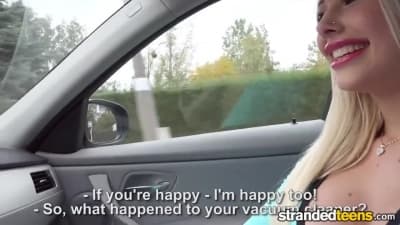 Eine junge, nuttige Blondine mit sehr großen Titten steigt eifrig in das Auto eines Fremden und lutscht noch eifriger seinen Schwanz, der sie gleich ficken wird