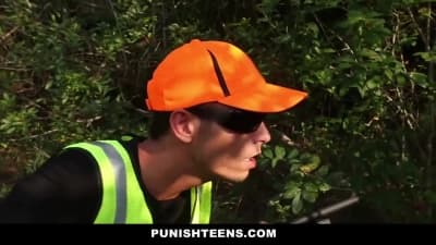Ein Teenager-Mädchen wird auf den Feldern gefesselt, von einem Jäger gesehen und von ihm gefickt, der sie in der freien Natur sehr dominiert.