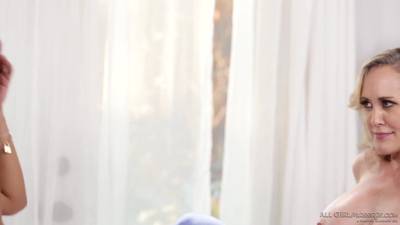 Die erhabene blonde Milf Brandi Love schlüpft in die Rolle einer etwas frechen Masseurin, um sich schließlich mit der schönen Brünetten zu vergnügen.