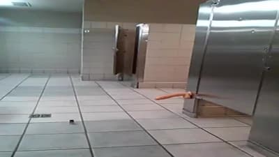 Dieser mollige Typ ist in einem öffentlichen Badezimmer und benutzt seinen Dildo, um sich selbst abzuspritzen, bevor er erwischt wird.
