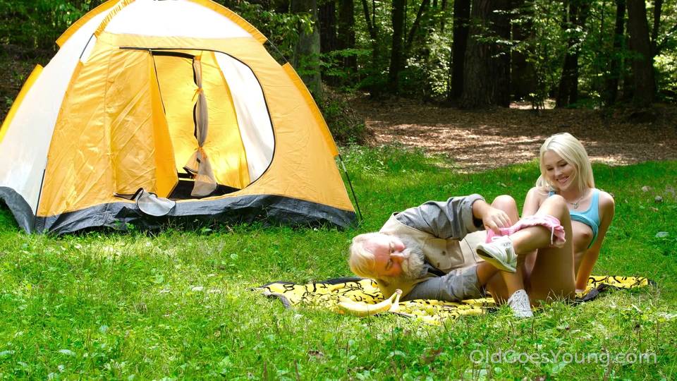 Ein schönes blondes Mädchen zeltet und genießt die Natur, als ein alter Mann auftaucht und sie geil macht. Sie spreizt ihre Beine weit offen für ihn!