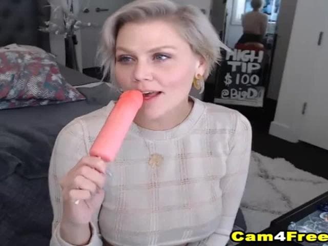 Diese sexy Blondine spielt alleine mit sich selbst, als sie einen Dildo lutscht und ihre großen Titten vor der Kamera streichelt.