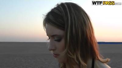 Schöne Blondine bläst ihren Mann und wird bei Einbruch der Dunkelheit im Sand am Strand gefickt. Doggy Style ist ihr Ding