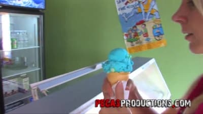 Sie geht, um sich ein Eis zu kaufen und sich damit zu streicheln. Sie verteilt das Eis auf ihren Lippen und auf ihrem kleinen Kitzler,