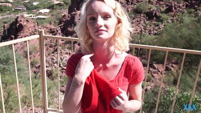 Er greift sich die Blondine, die es kaum erwarten kann zu ficken, und bringt sie an einen privaten Ort in der Sonne, damit sie den Schwanz genießen kann.