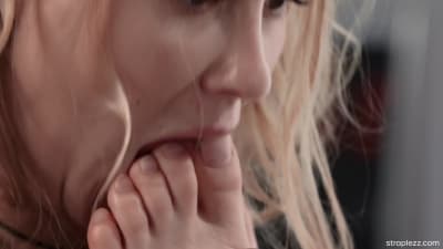 Ein Paar sexy blonde Mädchen, die sich miteinander vergnügen und einen Strap-On Dildo als zusätzliches Vergnügen benutzen.