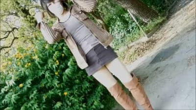 Dieses junge japanische Mädchen liebt es, im Garten spazieren zu gehen. Sie liebt es, ihre Formen zur Schau zu stellen. Das Mädchen amüsiert sich.