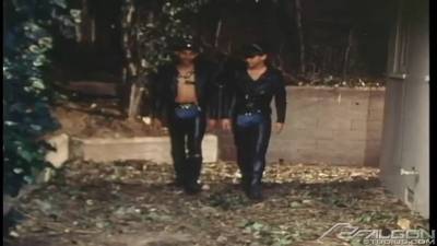 Junger Blonder Twink der von zwei Männern in Leder dominiert wird