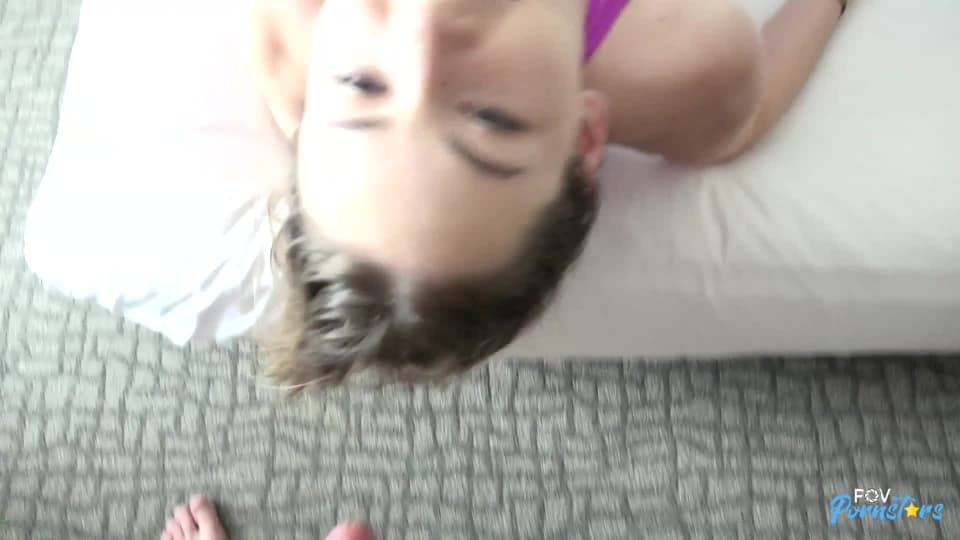 Das junge, freche Mädchen neckt ihren Mann mit ihrem kleinen rosa Outfit, indem sie sich selbst berührt, bevor sie ihm einen bläst