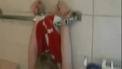 Hier ist ein junges, blondes Mädchen, das im Badezimmer sehr unterwürfig ist! Sie ist gefesselt und wird mit heißem Wasser übergossen!