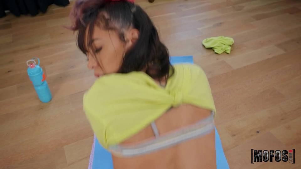 Die sexy, freche Brünette beendet ihre Aerobic-Session mit einem schönen Schwanz in ihrer Fotze. Sie ist ganz nass!