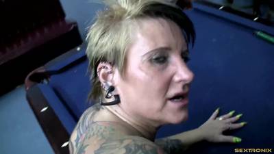 Stark tätowierte Frau mit einer mit Piercings übersäten Muschi, lutscht einen Schwanz und wird hart gevögelt.