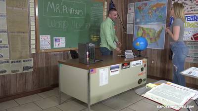 Kinsley Anne ist die Hure der Schule und in diesem Video wird die Blondine zwei Lehrer ficken und blasen.