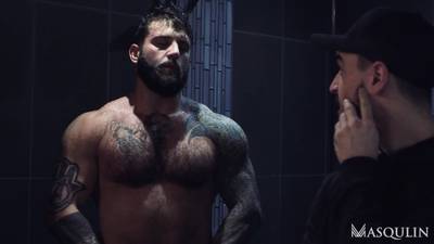 Jay und Ryan lutschen sich gegenseitig die Schwänze und ficken sich in die Ärsche vor den Augen des muskulösen Markus, der die Szene beobachtet und es genießt