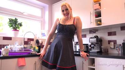 Reife Blondine ist in ihrer Küche und ist nicht zu kochen! Sie zieht sich bis auf ihre sexy Unterwäsche aus, zieht auch diese aus
