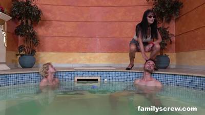 Oma fickt mit den Freunden ihres Enkels im Schwimmbad