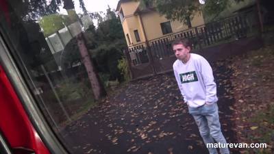 Zwei reife Männer teilen sich eine unschuldige Jungfrau in einem Van