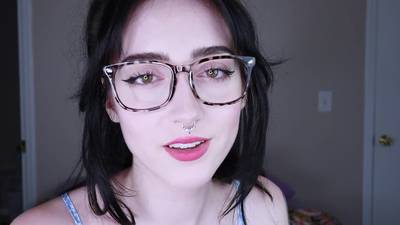 Brünette mit Brille hat ein hübsches Gesicht, interessante Tätowierungen und ein zartes Äußeres, aber sie ist eine Schlampe, die gerne Schwänze lutscht