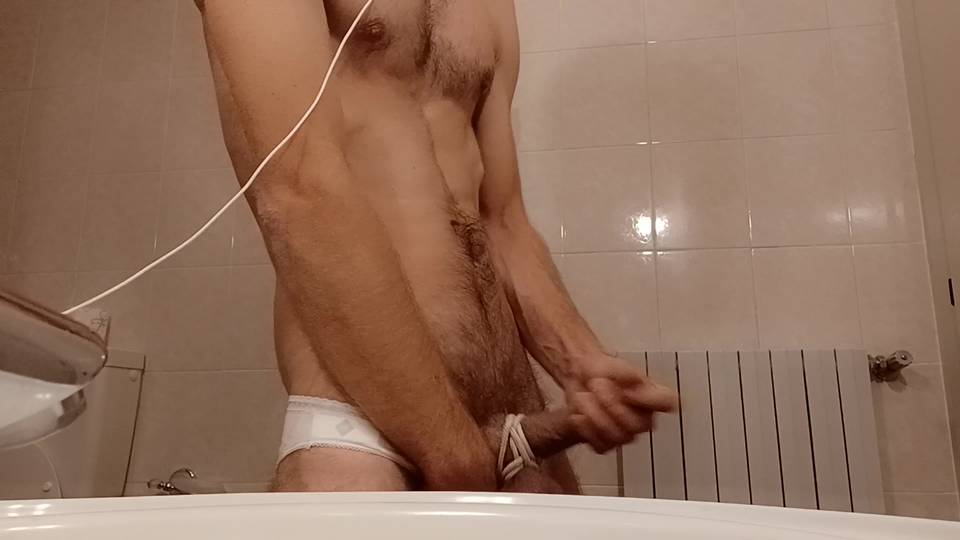 Mann masturbiert seinen großen Schwanz im Bodage-Stil
