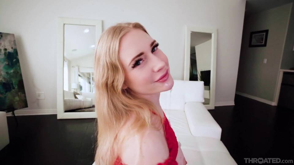 Die hübsche Blondine hat Lust, den Schwanz zu fressen, und das wird ihr auch gelingen, denn sie speichelt ihn ein und bietet ihren Hals zum Klopfen an!