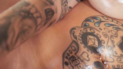 Liebkosungen, Pussy-Penetration, Tattoos, große natürliche Titten und Lust: das ist es, was du in der lesbischen Szene sehen wirst