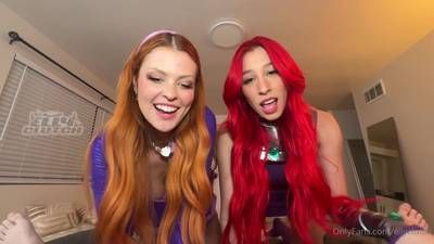 Zwei Mädchen mit roten Haaren und großen Titten erscheinen in einer POV-Amateur-Szene, in der sie einen großen Schwanz lutschen