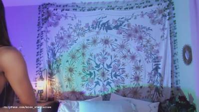 Nacktes schlankes Mädchen mit langen Haaren macht es sich auf dem Bett bequem und masturbiert solo für ihre treuen Amateur-Zuschauer.