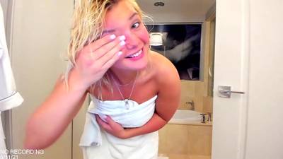Eine sexy Blondine mit großen Titten macht sich vor der Kamera nackt, während sie sich auf ein Bad in der Badewanne vorbereitet.