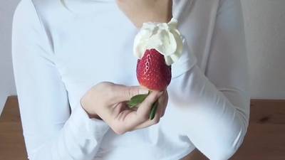 Dieses Webcam-Model übt ihre Fellatio-Fähigkeiten mit einer riesigen Erdbeere. Die Schlagsahne steht für Sperma,