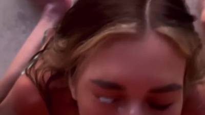 Junge hübsche Schlampe saugt den Schwanz eines Kerls gründlich aus, weil sie ihn tief mit ihrer Fotze