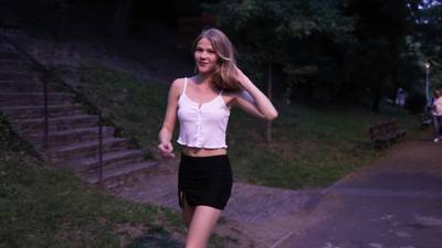 Ein blondes Teenie-Mädchen, das frühmorgens durch die Stadt spaziert und ihre Brüste und ihren süßen Arsch zur Schau stellt, indem sie ihre Kleidung hochhebt