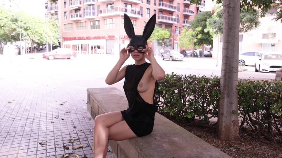 Eine sexy blonde, wohlgeformte und schlanke Teenagerschlampe in einem schwarzen Cosplay-Outfit spaziert durch den Park und zeigt ihre rötlichen Titten