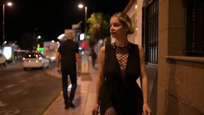 Schöne Blondine zeigt ihren nackten Körper auf der Straße bei Nacht