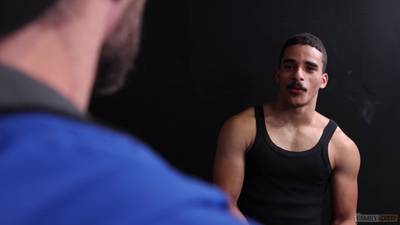 Der muskulöse Stiefvater Rico Raunch geht auf die Knie und lutscht seinen Stiefsohn