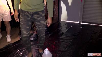 Schwarze und weiße Twinks Orgie voller Öl und Blowjobs