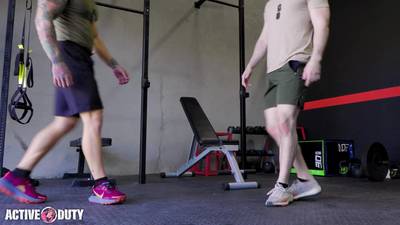 Gefreiter Jeremiah Cruze betet Damien Kings dicken Schwanz nach einem harten Training an und würgt tief, bevor sein enger Arsch roh gepoppt wird