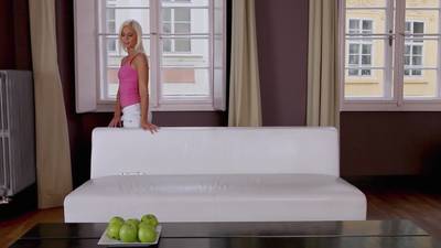Lola ist ein geiles blondes Babe, das mit Spielzeug auf der Couch masturbiert
