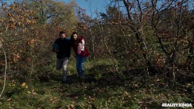 Die Touristen Candie Luciani und Juan Lucho bitten eine Wanderin, sie beim Ficken im Wald zu filmen, indem sie ihre Muschi an einem Baum fingern und stoßen