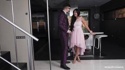 Die tätowierte Yorgelis Carrillo, gekleidet für einen formellen Tanz, lässt ihren nerdigen Freund stehen, um den großen schwarzen Schwanz ihres Mitbewohners Jesus Reyes zu lutschen und ihn hart auf dem Bett zu reiten