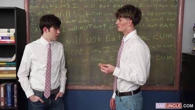 Collegue-Teens nutzen die Abwesenheit im Klassenzimmer, um sich gegenseitig die Schwänze zu lutschen und die engen Arschlöcher der anderen zu lecken