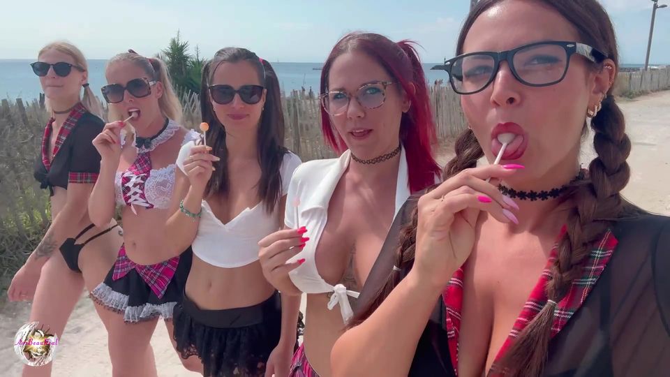 Eine Gruppe schöner, vollbusiger Mädchen begibt sich zu einem Mehrfach-Gangbang
