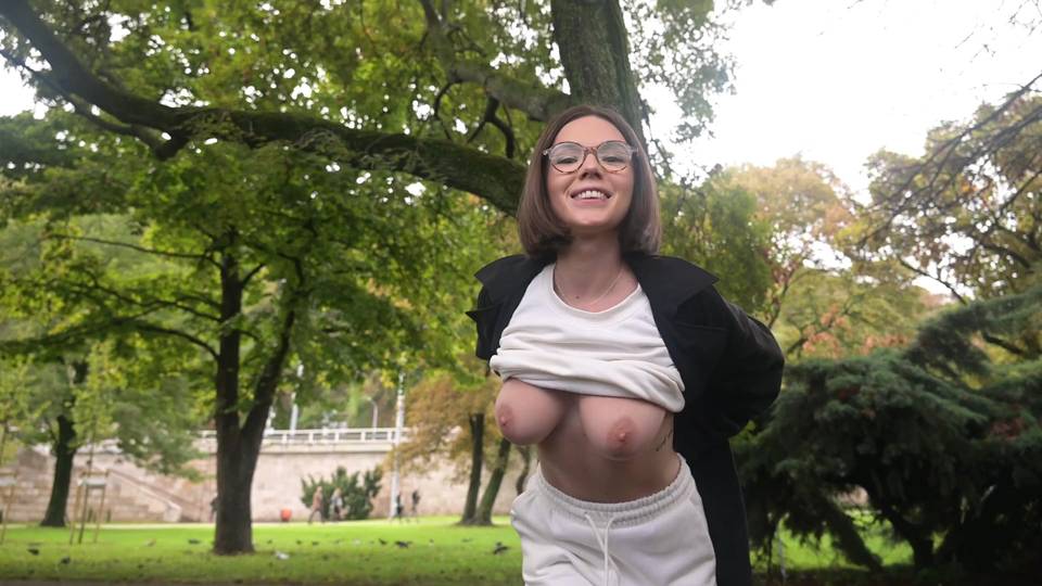 Jüngeres vollbusiges Babe zeigt sich im Park mit ihren Brüsten in der Luft
