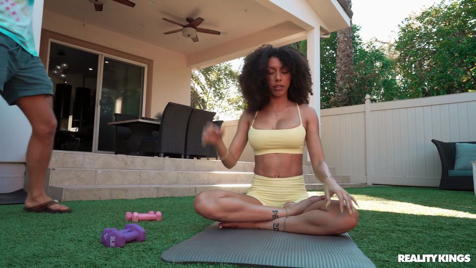 Während des Yoga unterbricht sie ihre Cousine. Er will mit ihr mit der Wasserpistole spielen, aber der Schwarze hat eine Idee: den Schwanz seines Freundes lutschen.
