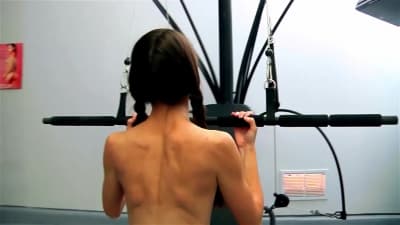 Diese Brünette ist eine biegsame Schlampe, die sich heute allein im Fitnessstudio amüsiert, während sie nackt trainiert und uns zeigt, was sie kann.