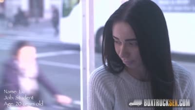 Diese brünette Schlampe will diesem Mann in einem Lastwagen mit Glaswänden erregen, wo sie beim Ficken die Straße sehen können.