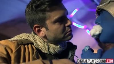 In der Parodie-Szene wird ein schönes, blauhäutiges Alien-Mädchen gefangen und gefoltert - von zwei Typen, die mit ihren Schwänzen in ihren Mund sind.