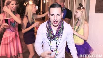 Blonde, lesbische Frauen in bunten Outfits genießen eine gute Sexparty! Sie feiern zu Hause, auf der Veranda und auf der Straße zum Karneval, nackig und frisch