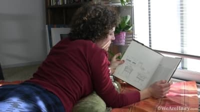 Die schöne brünette Meg amüsiert sich, indem sie ihre behaarte Muschi vor der Kamera zeigt, was sie geil macht.