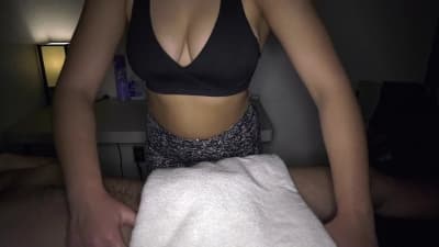 Dieses vollbusige Mädchen gibt ihrer Ölmassage ein Happy End. Sie reibt ihn so schön ein, dass er über ihre sinnlichen Hände explodieren muss.