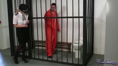 Diese blonde Gefangene geht auf die Knie, um seinen Schwanz zu lutschen. Dann hat sie ihr Gesicht vollständig mit seinem Sperma bedeckt